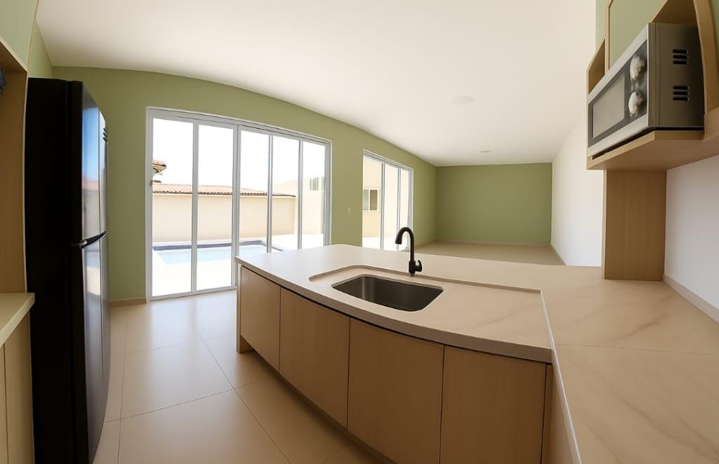 Casa Térrea Moderna: Design com pé direito alto (3m), proporcionando amplitude e excelente iluminação natural.