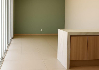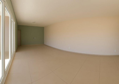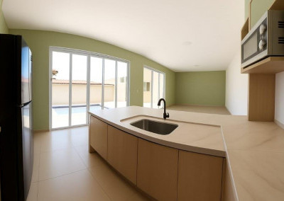 Integração Total: Sala, Copa e Cozinha em conceito aberto, integradas ao lazer por uma ampla parede de 8 metros com portas balcão de alumínio que vão do chão ao teto.